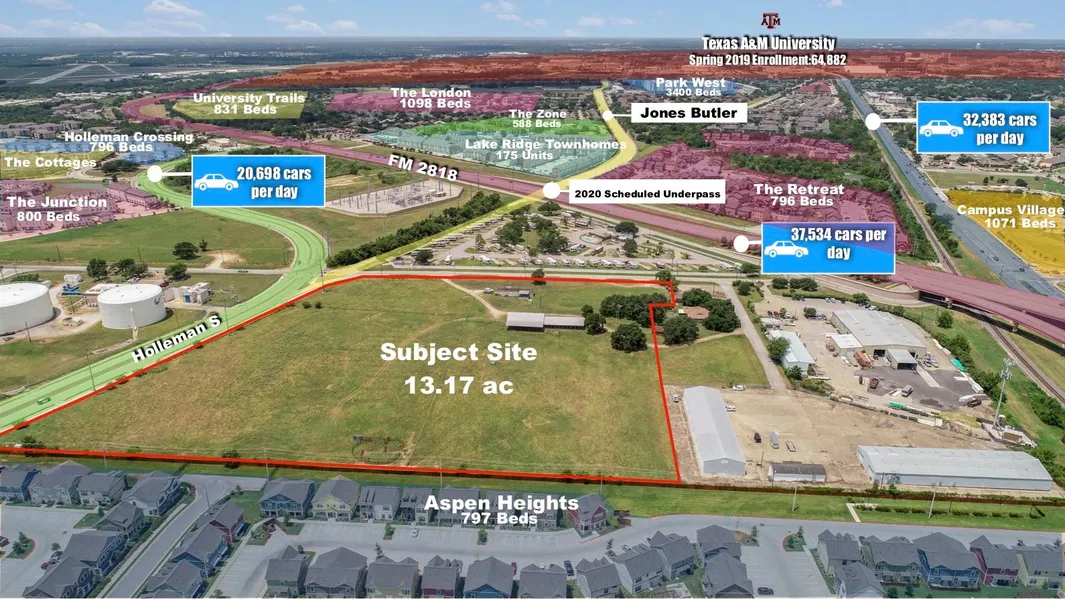 Rare 13+ acre infill development opportunity, adjacent to FM 2818 and Wellborn Road, surrounded by institutional multi family projects. All utilities in place and general commercial / high density land use planned by City of College Station.