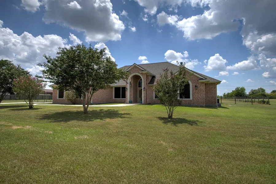 Country living just minutes from town,fenced with barn.Absolutely beautiful 1 story home with high ceilings, deep crown moldings,graceful columns,hard surface flooring,huge windows with great views.Large covered entry porch with grand front door opening into GREAT ROOM with wall of custom built-ins & wood burning fireplace,FORMAL DINING ROOM could be utilized as music room with beautiful crown moldings & chair railing.Open ISLAND KITCHEN has granite counter tops,upgraded appliances & walk in pantry,BREAKFAST room is large enough for table for 10-12.MASTER SUITE & MASTER BATH double sink vanity,whirlpool tub & separate walk in shower,linen closet plus MASTER CLOSET.Guest wing has 4 additional bedrooms with display shelves & great closet space,2 baths with one set up as Jack & Jill bath)GAME ROOM with french doors to covered parking area.Large indoor LAUNDRY room with extended counter & sink area.Bring your horse,enjoy vegetable gardening or fishing in the neighborhood ponds.NO FLOODING