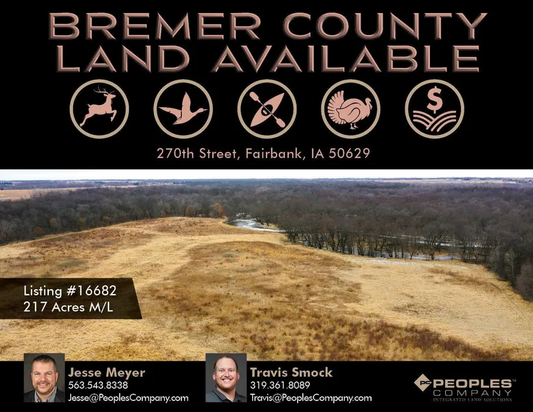 Peoples Company is pleased to present a 217 acre m/l riverfront, recreational, and CRP farm in Bremer County, Iowa. This income-producing farm is set up to grow and hold wildlife including whitetail deer with a perfect mix of mature timber and CRP for cover, water provided by the Wapsipinicon River, and a healthy amount of income to support this great asset. There are 115.22 FSA Cropland acres carrying a CSR2 of 53.0 that are currently enrolled in the CP23 CRP program. The CRP contract pays $343.05 per acre or $39,526.00 annually and expires in 2024. The property feels even larger than its size with Bremer County's 166 acre m/l Seven bridges Wildlife Area along the west border and Iowa DNR's 1,428 acre Aldo Leopold Wildlife Area along the north border. The open CRP fields are conveniently surrounded and or neighbored by timberland, creating an ideal wildlife bedding area for whitetail deer, turkey, and pheasants, and features a large permanent hunting blind. In addition to the hunting value, the farm provides recreational fun for the entire family with nearly two miles of ATV trails and over a quarter mile of Wapsipinicon river bank frontage allowing for fishing, waterfowl hunting, kayak/canoe access, and swimming from the sandy beaches. This great property is located between Readlyn & Fairbank at the end of 270th Street in Sections 27 & 28 of Franklin Township, Bremer County, Iowa.