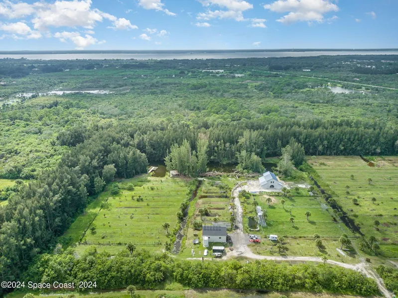 Rare Beauty! Riviera Ranch a 21-acre property of self-sustaining and operational farmland. Located on North Merritt Island steps from the Kennedy Space Center Complex, it offers a secluded wooded boundary hiding a horse trail for riding and a picturesque, fish-stocked freshwater lake and dock. For those who enjoy hosting, there's a shaded gazebo deck and a charming treehouse. The property includes an RV & tractor garage with a studio apartment above, perfect for breaks and meal prep during long days. Goat Barn that features 3 rotational pastures, Chicken Coop with a 40ft enclosed run. 10 acres of lush pastures are divided into 6 rotational fields and 2 enclosures. The farm is dotted with a variety of tropical fruit and nut trees, berry patches, and vegetable gardens that thrive year-round. Plus, pump house for water management & irrigation. Additionally, a stunning Barn is under construc...