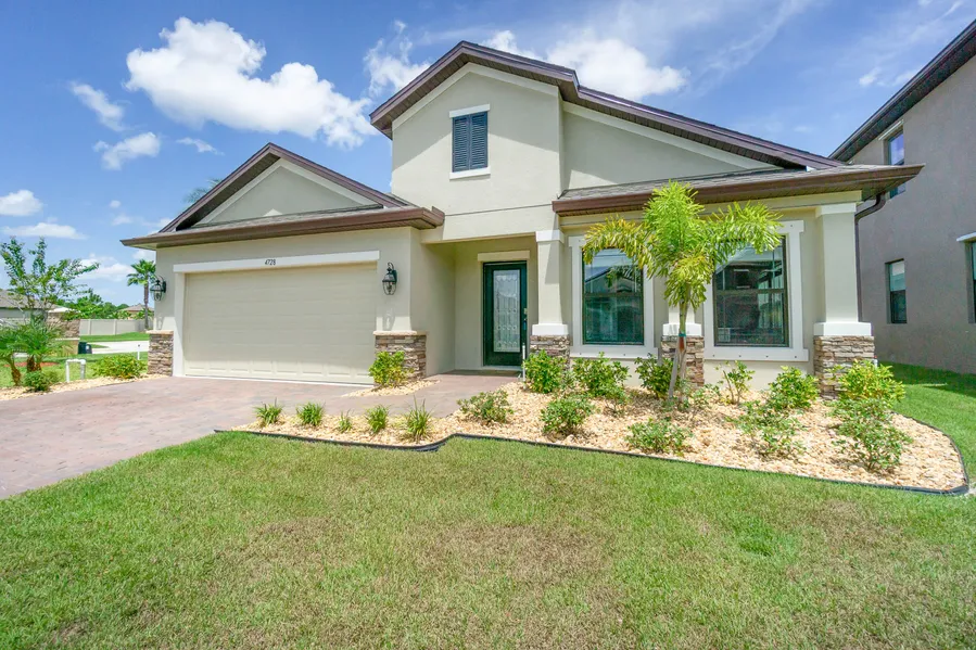 Why wait to build? This one yr old home has been lovely cared for and many upgrades have been added since it was blt including a fully fenced yard w/ gates on both sides, rain gutters, an ADT security system w/ sensors on all windows and doors, window blinds, ceiling fans, and mulch removed and replaced with river rocks. 3 bdrms plus a huge office which could easily converted to a 4th bdrm. Open and functional kitchen with an oversized kitchen island. Bus stop within 50 ft of front door. Screened patio. Gated community with an 8,000 sq ft clubhouse, fitness cntr., resort style pool including a 2 story corkscrew slide, and a beach area splash pad. Tennis and volleyball courts, fenced playground, stone fire pit gathering area, an outdoor movie viewing area, and so much more!