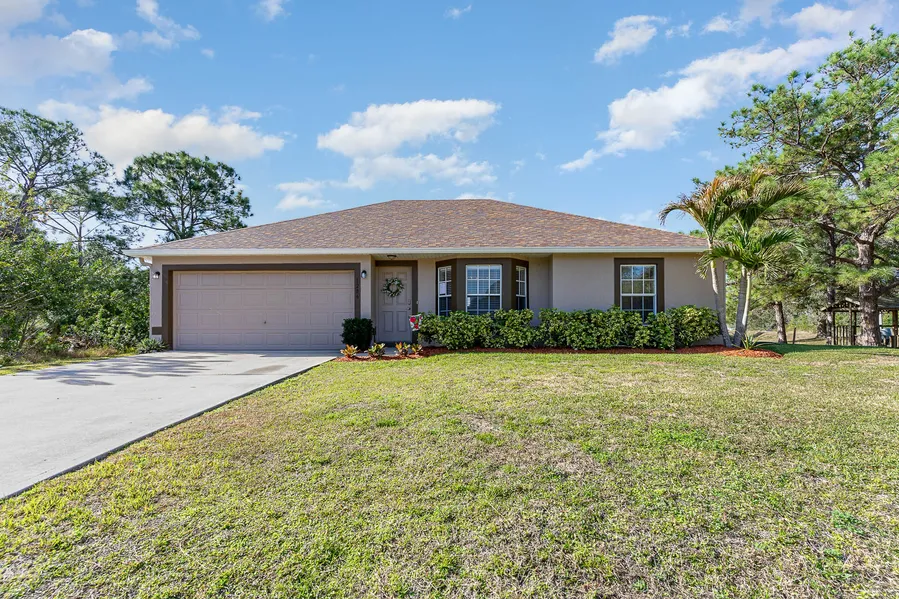 BRAND NEW 30 YR ARCHITECTUAL ASPHALT SINGLE ROOF, GOODMAN 2.5 TON A/C AND 50 GALLON WATER HEATER! NEW NEW NEW: interior and exterior paint, carpet, appliances, ceiling fans in mstr bdrm and family rm., faucets in mstr shower and 2nd bath, coach lights, spring in garage door. MOVE IN READY, nothing to be done in this well maintained home. Situated on a nice quarter of an acre lot with a lg drainage canal behind the home. Septic in the front and well in the back, still leaving plenty of space for a pool. House was built by Maronda. Septic was pumped one year ago. All appliances convey, including washer and dryer. Conveniently located to nearby restaurants and shopping.