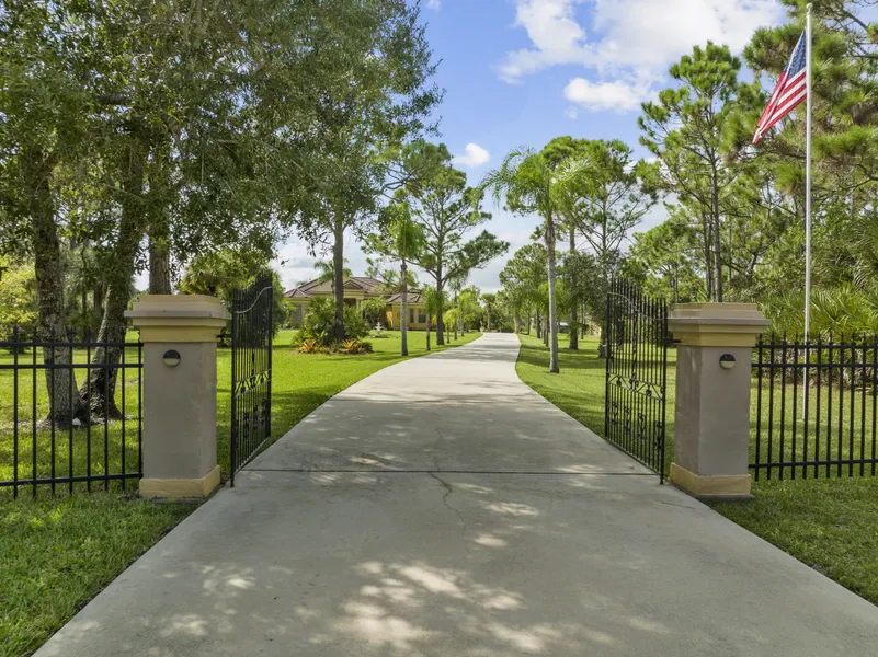 Prepare to be impressed by this magnificent 9.8 acres+/- Mediterranean Estate. This 2,541sqft (under air, 3,400sqft under roof) home offers a private cul-de-sac, oversized 2 car attached garage, 3 car detached garage, spacious barn with loft, potting shed, stall for livestock, gazabo, .75+/- acer lake stocked with koi and tilapia, and a smaller pond. The moment you enter the stunning gated front entry with cement pillars and 4' commercial grade aluminum fencing, a tranquil feeling greets you and lures you in. Driving up the 250' concrete driveway, past the lush green lawn, and large Mediterranean style fountain, the exquisite residence comes into view. Paradise found on this breathtaking four bedroom, and three full baths estate from every vantage point. Constructed in 2001 by Hight End Joyal Builders the luxurious and well-designed living spaces is evident by the round corners on interior walls, 10-foot+/- ceilings, wired for stereo system, recently (2022) updated digital security system, active smoke detectors, carbon monoxide detectors, gas water heater, and shutters for all windows, front door, & two car garage. Surrounded by Grant Flatwood Preserve, offering relaxation and tranquility while being entertained by the abundant wildlife. Luxury starts the moment you enter the residence thru 8-foot decorative double doors. You are greeted by a 20+/- foot entry foyer, living room, and formal dining room. The dining room makes for the ideal dinner party setting. Double doors from the living area open to a study which can be used as a fourth bedroom. Conveniently adjacent to the cabana bath. Enter the Owner's Suite thru decorative double doors. This private oasis offering two walk-in closets, relaxing sitting area, abundance of natural light, and sliding doors leading to the pool deck. The formal living room offers an elegant feel with tile floors, sliders opening out to the covered lanai, pool area and lake. Natural light from the windows highlights the beautiful custom finishes. The chef's kitchen is a dream: granite countertops are accented by cherry wood cabinetry and tile back splash. Top of the line stainless steel appliances including KitchenAid, five-gas burner cook top, electric range, dishwasher, refrigerator, and pull-out stainless steel shelves bins, makes preparation a breeze. A pantry and center island provide abundant storage space. For casual meals, the breakfast bar and breakfast nook are ideal. Enjoy beautiful view of the pool and lake. The light filled family room, adjacent to the kitchen, features a dramatic custom ceiling, majestic gas or wood burning fireplace with imported Brazilian hard wood mantel, and sliders opening to the screened Gunite saltwater pool, and acer lake. Relax by the pool and enjoy the stunning sunsets or just watch the deer parade through the property. The breezy fourteen-foot gazabo is the perfect spot to relax while watching the wildlife and getting lost gazing at the lake's water feature and grounds. Just across from the attached oversized two car garage with epoxy floors, bay window, and built-in cabinet storage; is the 960sqft detached three car garage, equipped with 9-foot+/- ceiling.