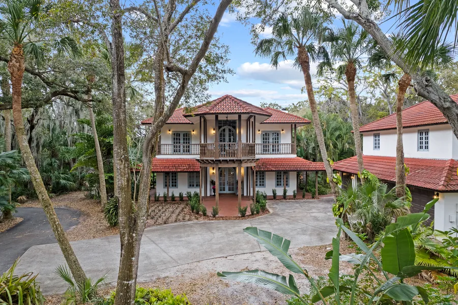 If you've ever dreamed of living in a magical place, protected and private in a secluded glen of majestic oak trees, then you have found your paradise! It's hard to place the exact genre of this design. There are moments when it reminds me of a South American Hacienda, other times, I feel, as though I am transported to the most unique Swiss chalet. This spectacular European design on 1.8 acres is one of a kind! Completely remodeled in 2022 without disturbing the antiquity of the wood-clad windows and solid brass hardware original to the structure, this home is an absolute compendium of new modern and centuries-old design. With the sweeping verandas, lush pool, and dock on the banana river one can't forget that you are still a riverfront property, despite the tranquility of your wooded enclave. The main house consists of a grand master suite with a balcony and magnificently marbled en sui...