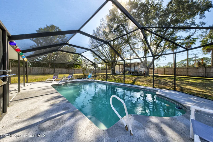 New roof in 2023! Concrete block pool home on over 1/3 acre comes with an RV (fifth wheel) that is already fully hooked up! Here's a great opportunity for you to have room for all the toys plus, with a little TLC, an RV bungalow that can double as space for family & friends getting away from the cold up north, or perhaps use as an income-producing unit. Tile floors throughout the home (no carpets). Huge fenced backyard with a free-standing carport for additional parking. Covered lanai and screened in pool. Great location with easy access to shopping and I95.