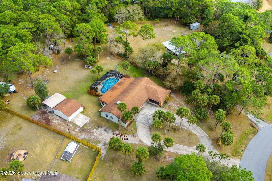 MOVE-IN READY- Single-family home- with a PRIVATE POOL and a large screen enclosed pool area. Situated on a large 1.45-acre lot- this home offers 3 bedrooms, 2 full baths, 2 garages and 1 carport- an attached 2-car garage, a detached 2-car garage/workshop. Plenty of ROOM FOR RV AND BOAT STORAGE. The home includes multiple living areas with a spacious living room, separate family room, and an updated kitchen that opens to the main living spaces. Interior features include vinyl plank flooring, granite countertops, a walk-in closet, and a wood-burning fireplace. Major updates include: 2020 roof, 2025 AC, 2025 pool heater, two water heaters, and a 2025 whole-house water filtration system. Additional features include RV hookup with 30-amp service, a well for irrigation, and natural gas available for hookup. Conveniently located near Cocoa Beach, Viera, Brevard Zoo, the Kennedy Space Center, Melbourne and Orlando International Airports, Disney World, and other attractions.
