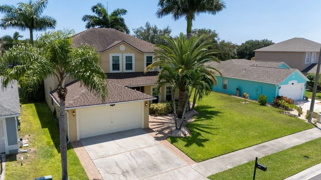 This beautifully maintained two story residence, is located in the desirable Grand Haven community and boasts over 2,360 square feet of living space. It features newer, energy-efficient, double hung, tinted windows and slider leading to the oversized patio, LVP and tile flooring. The interior offers four generously sized bedrooms and two bathrooms on the upper level, along with a versatile flex room and a half-bath on the main floor. The recently renovated kitchen, complete with an island and stainless steel appliances, serves as the home's focal point. With its low HOA fees and contemporary design, this property presents an exceptional family home. Additional amenities include a spacious screened saltwater pool with water features, a lovely lake view, and extra covered patio space, perfect for those afternoon Florida showers. Conveniently located near I-95, highly-rated schools, beaches, Viera Town Center, public parks, and Costco, this home offers unparalleled convenience.