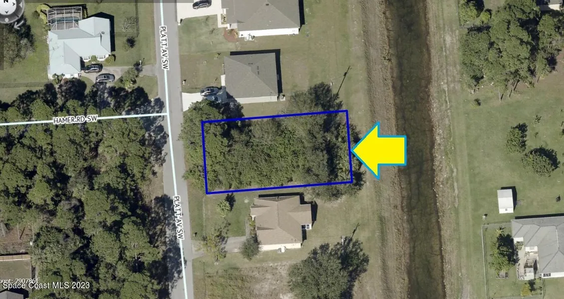 0.23 acre buildable residential lot available in Port Malabar Unit 32 of Palm Bay. Located in the southwest section, this lot has a drainage canal in the rear allowing more privacy, and is just 1 mile - 3 minutes to Bayside High School, 2.4 miles - 6 minutes to the Publix Supermarket, 12.7 miles - 29 minutes to Melbourne Airport, and 15.4 miles - 35 minutes to the beaches of Indialantic. From exit #176 of I-95 go west on Palm Bay Road for .7 miles, left on Minton Road for 3.3 miles, right on Jupiter Boulevard, left on DeGroodt Road for 1.9 miles, right on Falls Church Street, and right on Platt Avenue. The lot will be on your right.