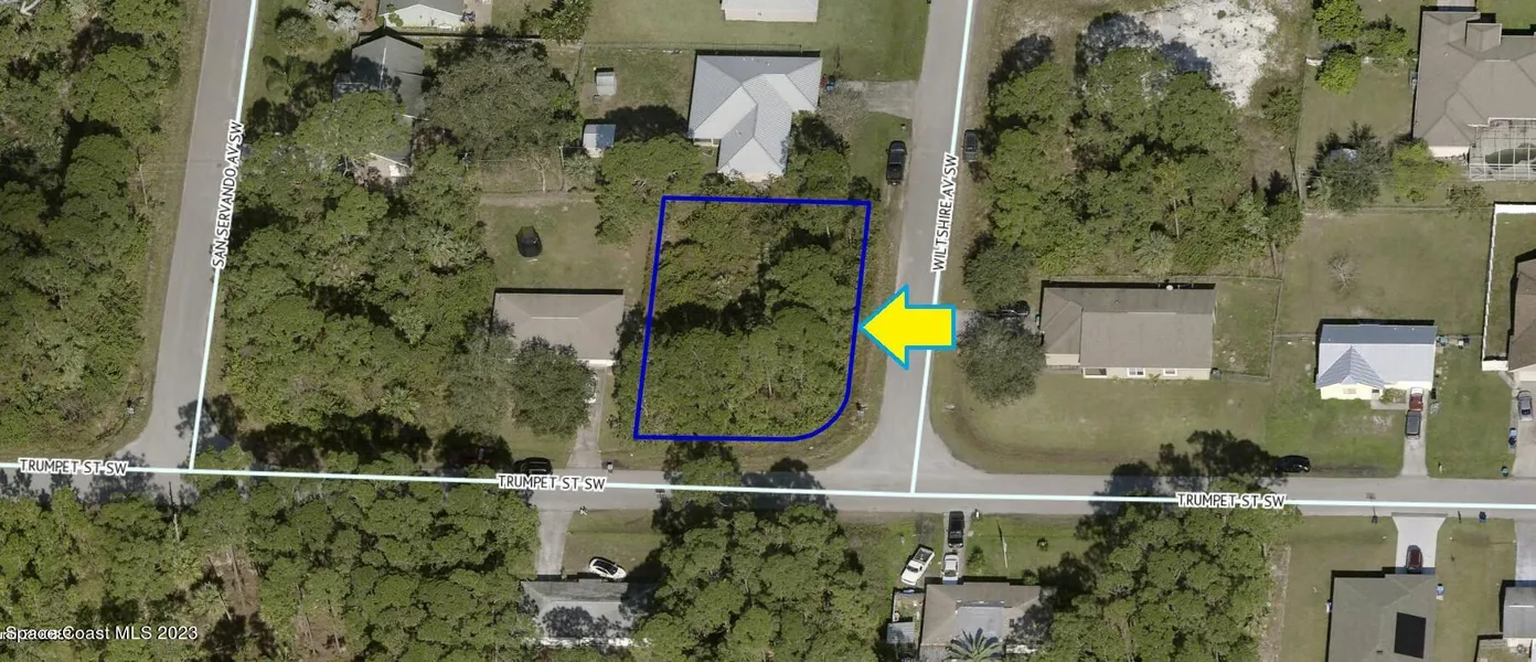 0.24 acre buildable residential lot available in Port Malabar Unit 19 of Palm Bay. Located in the southwest section, this corner lot is just 1.5 miles - 5 minutes to Jupiter Elementary School, 1.7 miles - 6 minutes to the Winn Dixie Supermarket, 11 miles - 28 minutes to Melbourne Airport, and 16.4 miles - 33 minutes to the beaches of Indialantic. From exit #176 of I-95 go west on Palm Bay Road for .7 miles, left on Minton Road for 3.3 miles, right on Jupiter Boulevard for .6 miles, right on Whitehall Avenue for .1 mile, road turns left and becomes Trumpet Street. The lot will be on your right at the corner with Wiltshire Avenue.