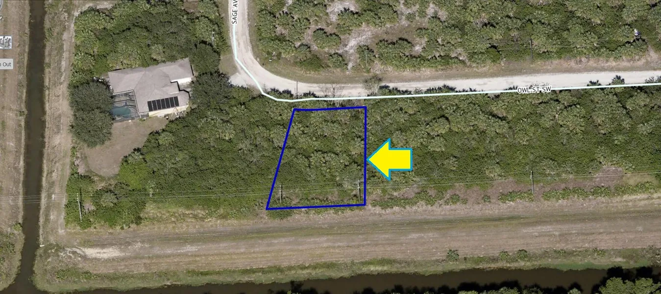 0.24 acre buildable single family residential lot [Rs2 Zoning] with an existing home 60 feet away and powerlines at the street and with a drainage right-of-way easement canal in the back for more privacy available in Port Malabar Unit #49 of Palm Bay. Located in the rural southwest section near the famous Compound Area, is just 3.4 miles - 7 minutes to Westside Elementary School, 5.4 miles - 10 minutes to the Publix Supermarket, 16.6 miles - 33 minutes to Melbourne Airport, and 21.2 miles - 36 minutes to the beaches of Indialantic. From exit #176 of I-95 go west on Palm Bay Road NE for .7 miles, left on Minton Road for 3.3 miles, right on Jupiter Boulevard for .1 mile, left on DeGroodt Road SW for 4.6 miles, right on St. Andre Boulevard for 1.2 miles, and left on Madden Avenue for .5 miles. Turn right on Owl Street and the lot will be on the left side of the road.
