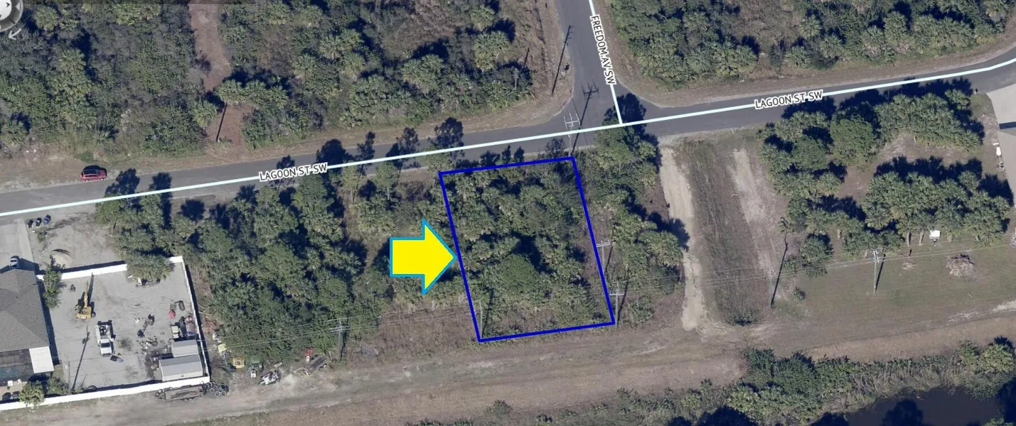There is a 0.23 acre buildable single family residential lot available in Port Malabar Unit #30. It is nicely located in the rural SW with powerlines at the street and nearby homes. The lot also has a drainage right-of-way easement in the back. It is conveniently situated just 4.7 miles -11 minutes- to Publix Shopping, 3.3 miles -8 minutes- to Bayside High and Westside Elementary Schools, and 17.6 miles -37 minutes- to the beach from Exit #173 of I-95. To reach the lot, you need to go west on Malabar Road SE from Exit #173 of I-95, then turn left on San Filippo Drive SE and proceed south for 7.3 miles. Continue on Degroodt Road SW and turn left on Cambria Avenue SW which becomes Lamargue Street. Finally, turn left on Fox Avenue, left on Ferguson Street, right on Toledo Avenue which becomes Lagoon Street. The lot will be on the left.