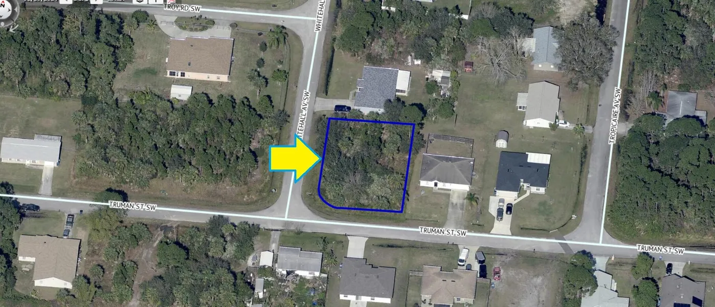 0.25 acre buildable residential lot available in Port Malabar Unit 19 of Palm Bay. Located in the southwest section, this corner lot is just 1,5 miles - 4 minutes to Jupiter Elementary School, 1.7 miles - 6 minutes to the Winn Dixie Supermarket, 11 miles - 24 minutes to Melbourne Airport, and 14.8 miles - 31 minutes to the beaches of Indialantic. From exit #176 of I-95 go west on Palm Bay Road for .7 miles, left on Minton Road for 3.3 miles, right on Jupiter Boulevard for .6 miles, left on Whitehall Avenue until you reach Truman Street. The lot will be on your left on the northeast corner.