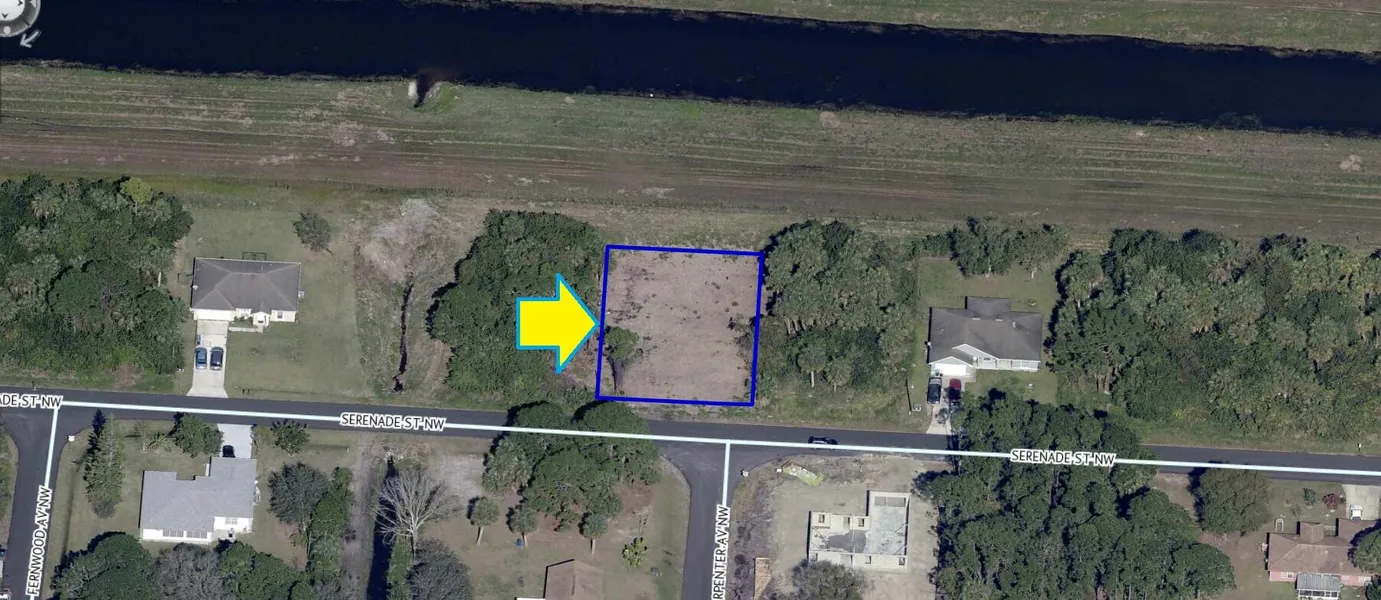 0.23 acre buildable residential lot available in Port Malabar Unit 14 of Palm Bay. Located in the northwest section, this lot has a drainage canal in the rear allowing more privacy, and is just 2.6 miles - 6 minutes to the Winn Dixie Supermarket, 2.8 miles - 6 minutes to McAuliffe Elementary School, 10 miles - 22 minutes to Melbourne Airport, and 13.1 miles - 29 minutes to the beaches of Indialantic. From exit #176 of I-95 go west on Palm Bay Road for .7 miles, left on Minton Road for .2 miles, right on Emerson Drive for 1.5 miles, left on Jupiter Boulevard for 1.3 miles, and right on Serenade Street. The lot will be on your right.