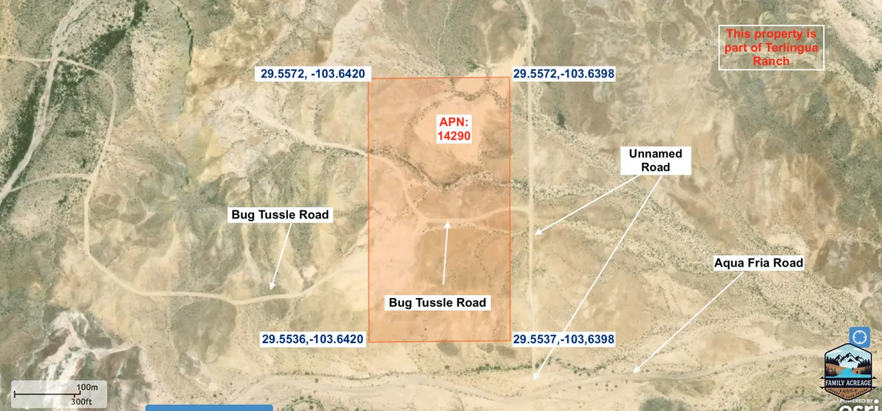 This property is located in Terlingua, Tx IN TERLINGUA RANCH. Sitting west of TX 118 , ~40 minutes from Big Bend Resort and Adventure, ~48 minutes into town of Terlingua, and ~1 hour and 16 min from Alpine. Unimproved and off the grid with a few to no residential building codes. This property has ACCESS! From Apline take TX118 S Turn R on Aqua Fria Road for 3.6 miles. Turn Left on Aqua Fria Road/Tony Hess Road for 2.9 miles. Turn Right on non named road for .2miles ( there are multiple roads like this in Terlingua Ranch that has been maintained, but not named). Take a Left on Bug Tussle Road right into the property. Put the center coordinates (29.55...