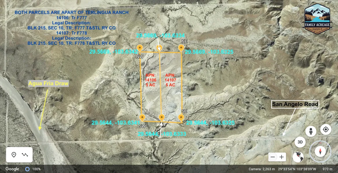 These property are located in Terlingua, Tx. Sitting west of TX 118, 30.2miles (~44 min) to Terlingua, 64.5 miles (~1hr 14 min) Alpine, 5.7 mile(~16min) to TX118, and 4 miles to Agua Fria Springs. This property is northwest of Paint Mountain and north east of Agua Fria Mountain and has close access from San Angelo Road. These are two separate 5 AC Tracts; they could be sold separately or together. Tr F777 appears to holds water in the riverbed better known as an arroyo that temporarily or seasonly fills with water. If you put the coordinates in google earth and zoom into the arroyo you will see that there is water in it. Act fast in purchasing this property because finding water out here is a very rare find.