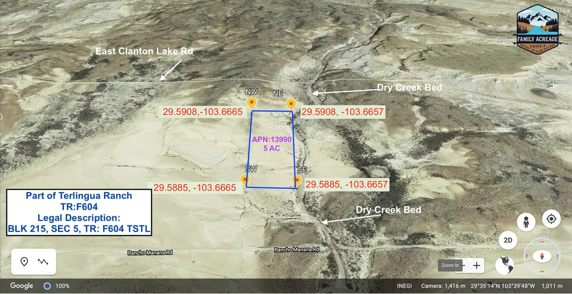 This property is located in Terlingua, Tx. Sitting west of TX 118 apart of the Agua Fria Subdivision, north west of Agua Fria Mountain and Paint Mountain. Good Access: East Chanton Lake Road is to the north of the property and Rancho Manana Road is to the south of the property. There is a dry riverbed that connects the street and will get you to the north east of the property. This land is excellent for searching for fossils and arrowheads, seeing the darkest skies that will light up your world, and to observing tons of wildlife including mule deer, javelina, fox, native birds and many more. Unimproved and off grid with few to no residential building codes. This property would also be great for a tiny house, natural builder, ecological living, and/or practice permaculture. Must requiring high clearance auto.