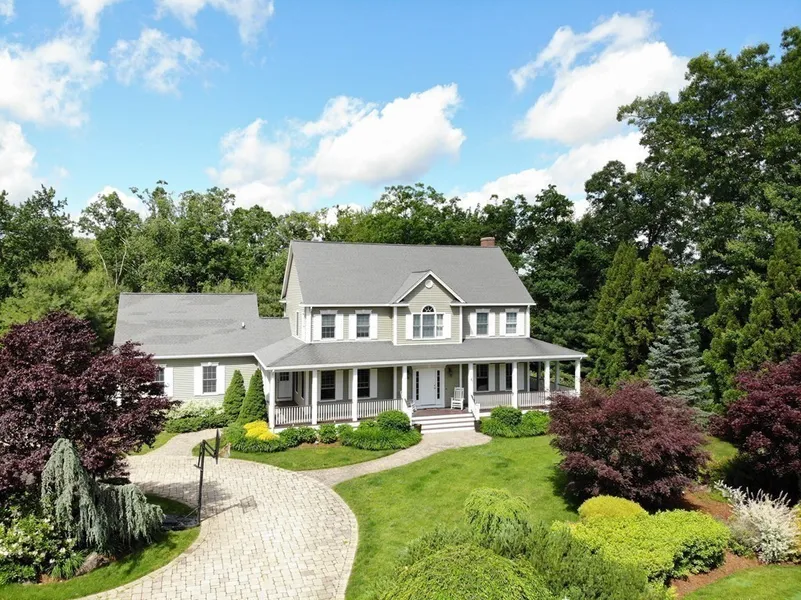 This stunning custom-built colonial awaits you with its welcoming circular paved driveway and gorgeous wrap around mahogany farmer's porch. The captivating landscape blissfully invites you to come and stay awhile to enjoy the natural beauty that surrounds this home. As you enter the front door you will be greeted by a lovely foyer with a handsome turning staircase. Brazilian cherry hardwood floors flow through the open floor plan on the main level. This home was designed for entertaining with a chef's kitchen including granite countertops, double ovens, sub-zero fridge, gas cooktop, copper sink and a wet-bar area that allows for friends and family to spread out in the heart of the home. This floorplan offers a front to back living room with a cozy fireplace, a formal dining room and flexible space to meet your needs. Lovely glass doors lead to the spacious deck and bring the beauty of the outdoors into this home. The second floor offers a generously sized primary suite with walk-i