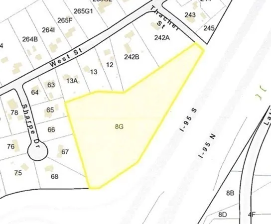 Opportunity Knocks! 5.3 +/- acres of land that would make a great lot for one house or possibly two. There is an older Preliminary Subdivision Plan showing more lots that was never approved. Because there is 47 +/- feet of frontage, there will be waivers/special permits required. City water and sewer are available. Sewer would come from Sharpe Drive. Buyer/Buyers Agent responsible for all due diligence. The land abuts the Route 95 right of way.