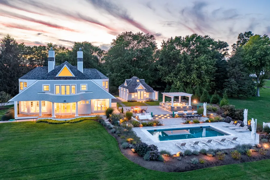This stunning, 3.2 acre, seaside compound is set on a sprawling lawn that gently rolls down to its own private beach, dock and mooring. Impeccably renovated, every feature, finish, appliance and system are new. The first floor is fully open, creating seamless flow through the dining and living spaces. Walls of windows and French doors invite light and water in at every angle. The gourmet kitchen has custom cabinetry, Subzero, Wolf and Bosch appliances, quartz counters and island. The first floor also features a large ensuite bedroom addition. Upstairs, a breezy seating area opens to a balcony overlooking the pool, apple trees, fragrant lavender and the bay. The adjacent primary suite has cathedral ceilings, a gas fireplace and office area. Two additional ensuite bedrooms and new balcony complete this floor. The lower level is finished with a gym, media room, office/BR, spacious laundry r...
