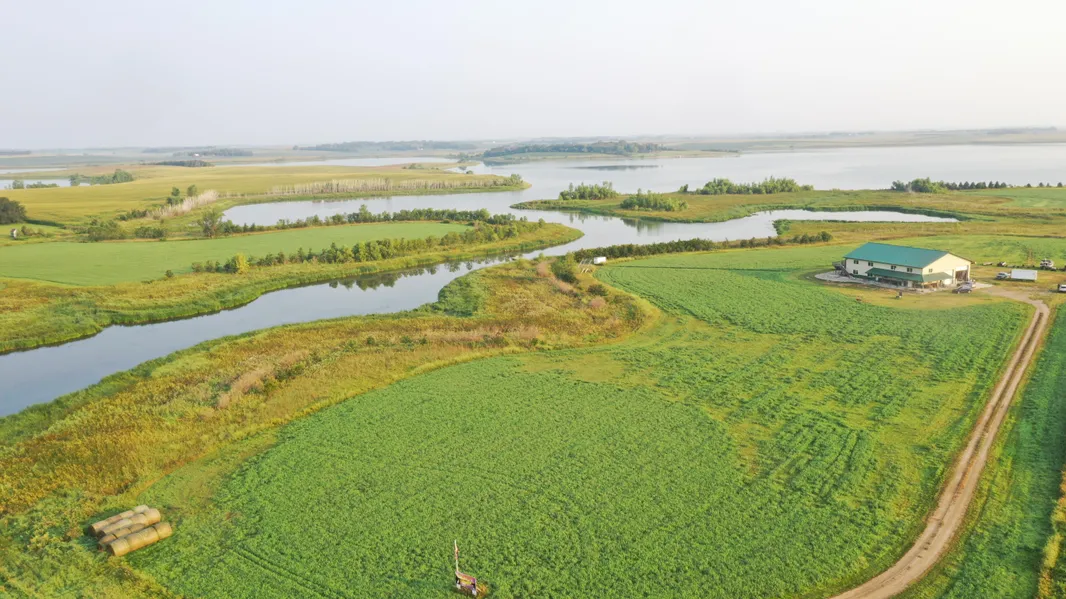 Location! Location! Location!!! Youre gonna love this rustic home that feels more like a retreat! With beautiful views, loads of space, and water front access, this property has it all!!! This 22.9+/- acres is conveniently nestled in the bay on the south side of Lake Sinai, which offers calm water access no matter the direction of the wind. Located just a mile from Sinai and a short 1/2 mile from the blacktop, this 5,184 finished sqft home built in 2012 offers peace and serenity of country living with water access, a main floor master bedroom, 1.5 bathrooms, an attached 2,208 sqft fully finished and heated shop with a lift (used as an elevator to the 2nd floor), main floor laundry, modern kitchen, 816 sqft 2nd story deck, cemented and covered patio space that spans 2.5 sides of the building, a beautifully hand crafted wooden staircase, and many more comforts for your lake oasis. This pro...