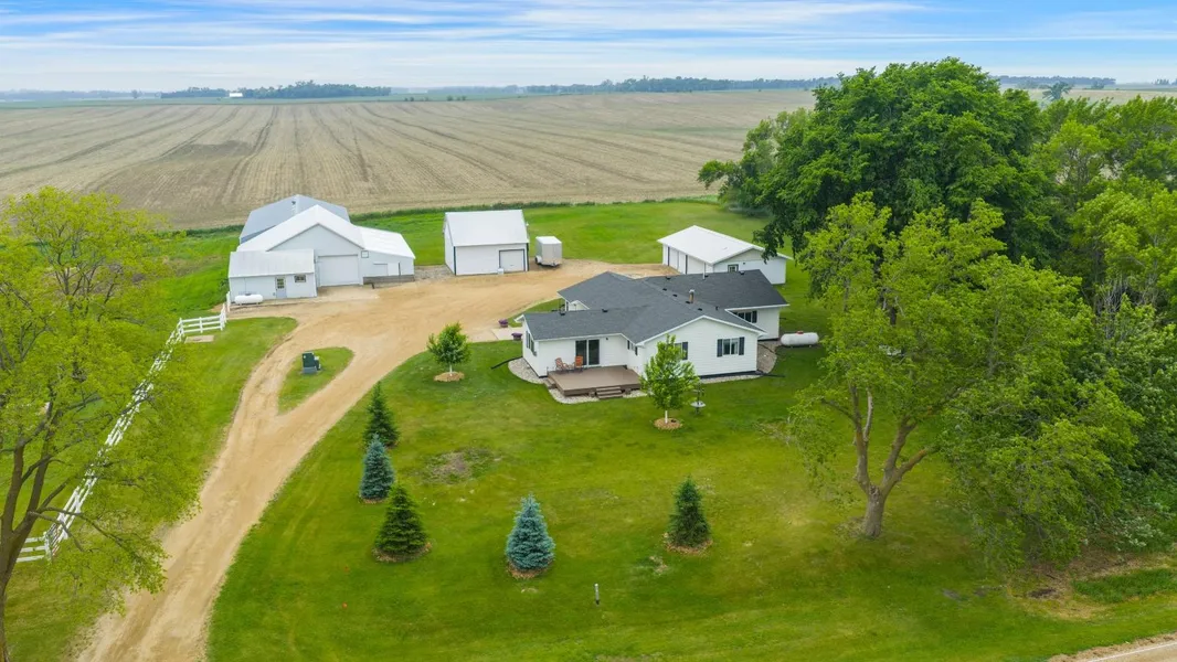 This 7.65-acre property offers country living with the convenience of easy access to Highway 14, located just a few miles west of Volga. The ranch home was built in 1961 and features 1,972 sq. ft. on the main level with an additional 936 sq. ft. in the basement. The layout includes 3 bedrooms and 3 bathrooms, with a large family room and generous storage space downstairs. The open-concept kitchen flows into the dining and living room areas, with tile flooring in the kitchen and hardwood floors in the living room. The spacious primary suite is a standout with vaulted ceilings, recessed lighting, a jetted tub, tiled shower, and tile flooring in the bathroom. Outdoor amenities include a 252 sq. ft. composite deck perfect for relaxing, a 288 sq. ft. attached 1-stall garage, and a 1,056 sq. ft. detached 4-stall garageideal for vehicles, toys, or workshop space. Several outbuildings provide ample storage or potential for livestock use, making this a flexible and functional acreage. Whether youre looking for peaceful country living, space for a hobby farm, or room to expand, this property offers a rare opportunity in a great location! Dont miss this auction & come prepared to buy!!