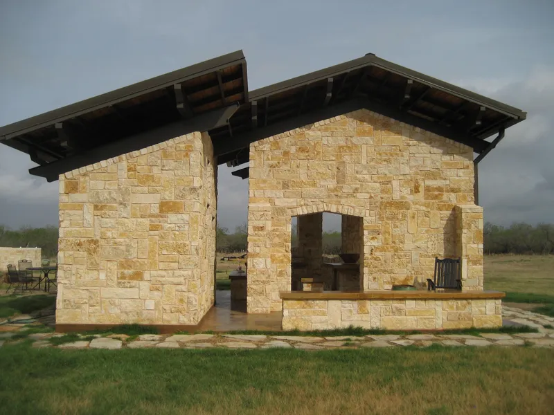 The property boasts three commercial-grade structures: a 900 sq. ft. open-air pavilion and bathroom erected with steel beams, cinderblock and limestone rock, metal roof, pine ceiling, concrete seating and countertops, oil rubbed bronze plumbing fixtures, and a farmhouse copper sink. The bathroom finishes include travertine tile floors to the ceiling and a mosaic tile shower area. The custom-designed vanity has a marble countertop, wrought iron base, copper sink bowl, oil rubbed bronze plumbing fixtures and authentic antique doors from Mexico. Separate and west of the pavilion is a custom-designed fire ring and seating area which is 30 ft. in diameter made of cinder block, limestone and slate. The unique building materials are cool during the summer season and warm in the winter.