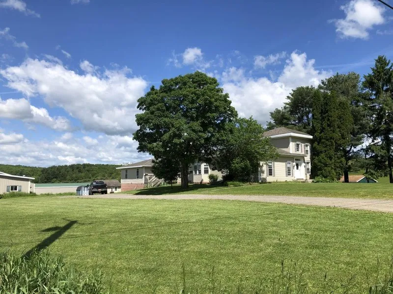 The owner was a building contractor who once employed over 30 employees. He built an office building with plumbing and a 7,000 watt solar electric system and several large pole barns to store his equipment and supplies brought by tractor trailer. The circular drive is built to withstand heavy loads and parking. Maybe you will want to open an auction barn, storage center, farm supply store, or convert the buildings to house horses, sheep or goats. Or, to process or store grains, hemp, or hops.