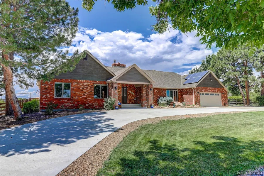 Sprawling 4300+ sqft. custom brick rancher on almost 2 acres! This Colorado country estate is the perfect combination of manicured lawns, mature trees/plants and horse facilities! This welcoming home has casement windows, solid wood 6-panel doors, gleaming wood floors, new carpet and on the main level features...sunken 13x20 living room with new wood floors, bay window and arched entry to formal dining room, with bay window and art/pottery niches...12x14 office with wood floors and divided light French doors...19x24 great room with vaulted ceilings, West-facing window wall, floor-to-ceiling brick fireplace, view up to loft and walkout to both covered Trex decks...updated, sunny eat-in kitchen with hickory cabinets, granite counters, all appliances including newer SS smooth top range with double oven and SS fridge, recessed lighting, two pantries, and walk-out to the covered deck...conven...