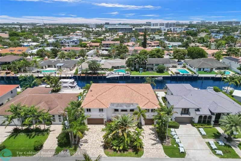 If you like an open floor plan this home is for you. Exquisite waterfront property, built in 2009, boasts 6,195 sq ft and 7,200 Tsq of elegant living on a 9,775 sq ft lot with 85 ft of waterfront and direct ocean access. With 5 bedrooms, including 2 opulent primary suites and 2 additional first-floor bedrooms, this home showcases soaring ceilings, an elevator, and dual laundry rooms for unmatched convenience. The chef's kitchen features a Sub-Zero refrigerator/freezer, Wolf gas cooktop, and double ovens. Outdoor highlights include a heated pool, spillover spa, and a private, fenced backyard. A spacious garage completes this masterpiece, the best deal per sq ft in Coral Ridge Country Club, walking distance to the club, restaurants, and the beach. Owner financing at a fair rate is available.