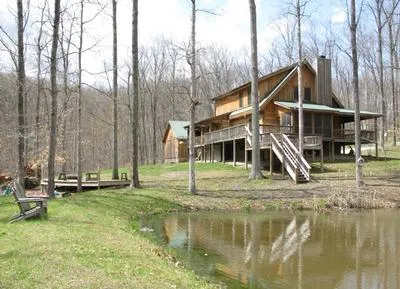 The epitome of Brown County-6x16 poplar logs milled by Helmsburg Sawmill, metal roof. Covered porch & deck wrap all 4 sides, covered breezeway to garage. Screened room. Inside you'll find beautiful hickory floors, poplar walls, hickory cabinets, stone accent on breakfast bar, Brown County stone fireplace, beamed cathedral ceiling. Master bedroom on main floor; loft and 2 bedrooms upstairs. Private pond adds to the natural beauty in this area. Paved road, common areas include 2 lakes.