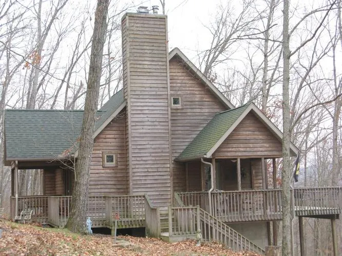 Rustic home has the feel of log--pine paneled walls and cathedral ceiling in great room along with a wood burning fireplace. Dining area takes full advantage of winter view across the hills. Kitchen has center island breakfast bar. Laundry room includes half bath. Big mba with whirlpool tub & separate shower. Great screened porch off mbr. Actually, there's a porch or deck on all 4 sides of the house so plenty of spots to enjoy the outdoors. Wooded 5 acres between Nashville & Bloomington