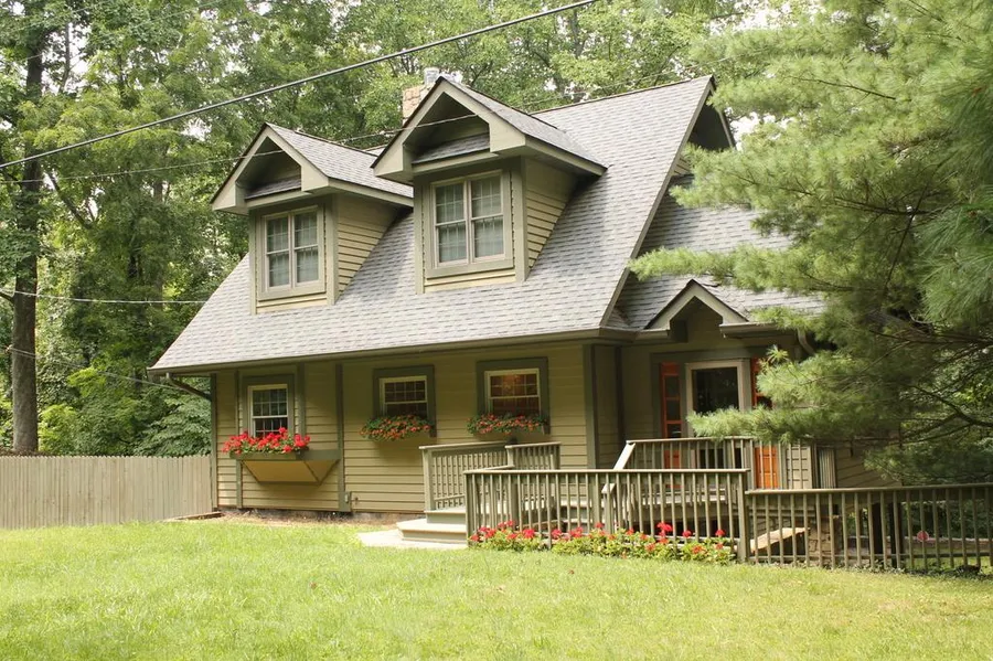 Striking cottage-style exterior plus beautifully finished addition. Start with a 15x10 foyer, LR has a wall of shelving for your book collection. Atrium doors open to FR with New Hampshire white pine floors and stone, wood burning fireplace. Master suite on upper level has large sitting room, dormered sleeping area, full bath & loads of closet space. Additional basement area for office or playroom, laundry room. Tall, deep windows. Wraparound back deck, private view. Fenced pet area. Hi-Speed