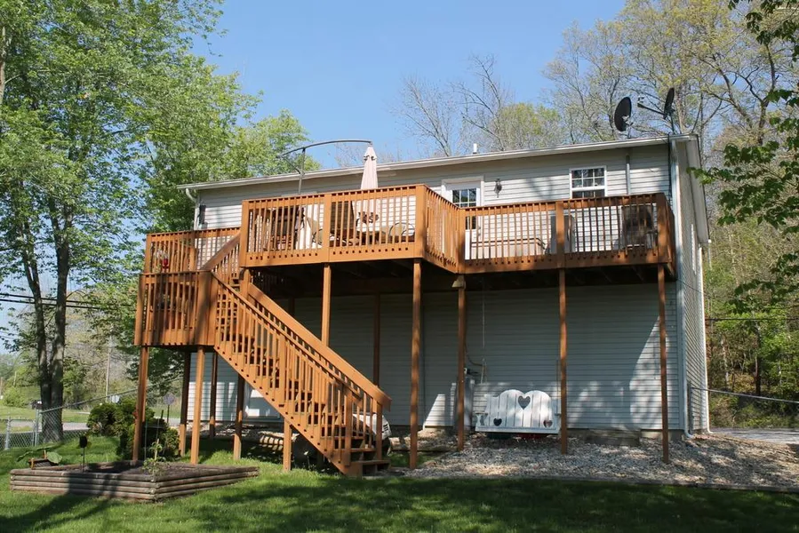 Horizontal wood paneling gives this home rustic warmth. Beautifully maintained inside and out. Living space is on upper level with first floor including lots of storage, 2-car garage. Living room with raised ceiling, small fireplace w/gas log. Master bedroom has full bath, His & Hers closets and door to deck. Covered carport has a guest room attached w/fba & mini kitchen. You'll really enjoy your time relaxing in the shelter house looking over the pond. Pond enclosed by fencing.