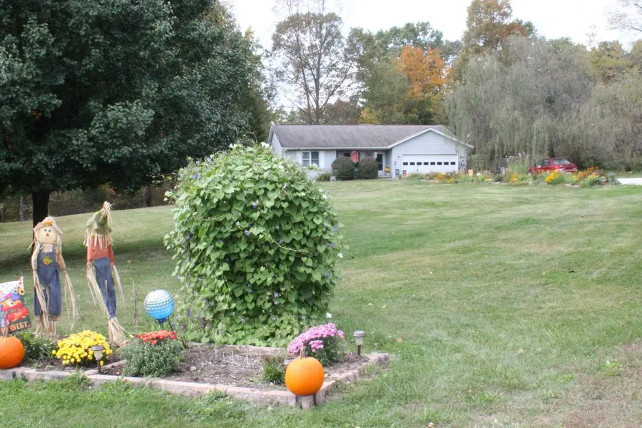 Watch the changing seasons across the stocked pond from the front porch. Large kitchen with breakfast bar and open dining area. Atrium door to landscaped back patio and more woods. Wide entry hall to living room. Laminated flooring. Master bedroom includes full bath and two double closets. Separate laundry room. If you're a dog lover you'll appreciate the high-fenced dog pen with extra large dog house attached to the two-car garage. 4x80 raised flower bed with hundreds of tulip bulbs & perennials. 6 miles S of 46 E.