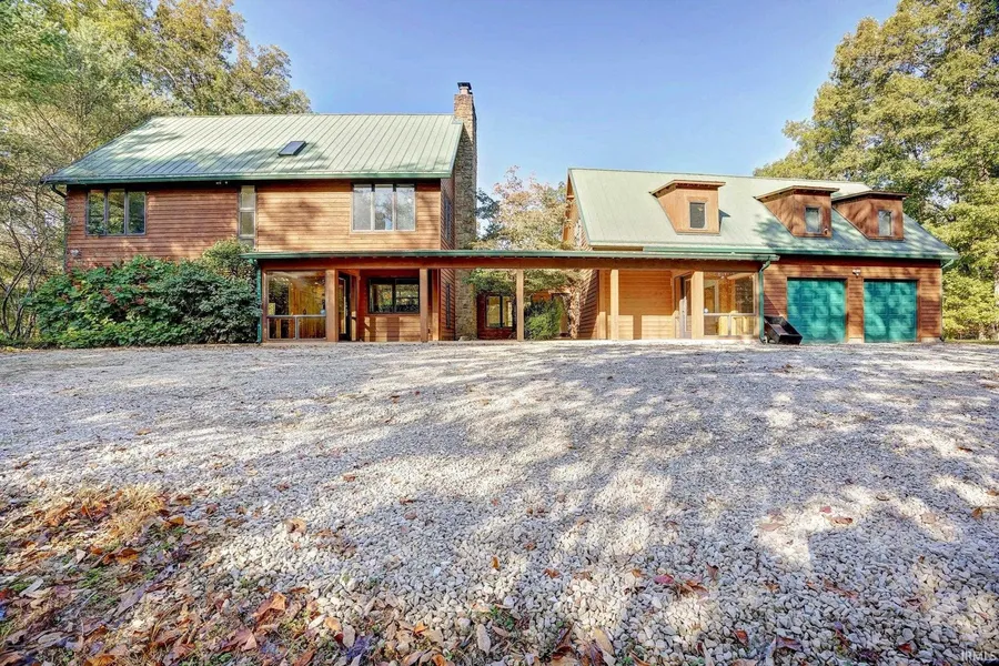 Ready for new owners is 760 Salt Creek, located in the famous rolling hills of Brown County Indiana. This 4 bedroom, 3.5 bath home is located on an impressive nearly 54 acre parcel, that features two large ponds and numerous ATV/hiking trails. The main home is over 3500 square feet of finished living space and features a large living area on the main level set off the kitchen that includes stainless steel appliances and beautiful solid wood cabinetry. On the upper level you will find 3 large bedrooms, including the primary suite with excellent tree views and a large en-suite bath/walk in closet. On the main level you will also find a separate wing of the home that was previously a detached garage and 1 bedroom apartment. This space has been seamless connected via a breezeway to the main structure and features another living space, a kitchenette and an oversized bedroom/bath perfect for hosting long term guests or for multi-generational living. A large deck spans the entire length of the back of home perfect for outdoor hosting or entertaining. Recent updates include new hardwoods in parts of the main level, refreshed lighting, new exterior doors and new window blinds throughout the home, some automatic for extra connivence. The opportunity to own a home on this amount of acreage located steps from all the action of Brown County is a once in a lifetime opportunity. Don't miss this one of kind contemporary home set amongst the trees!
