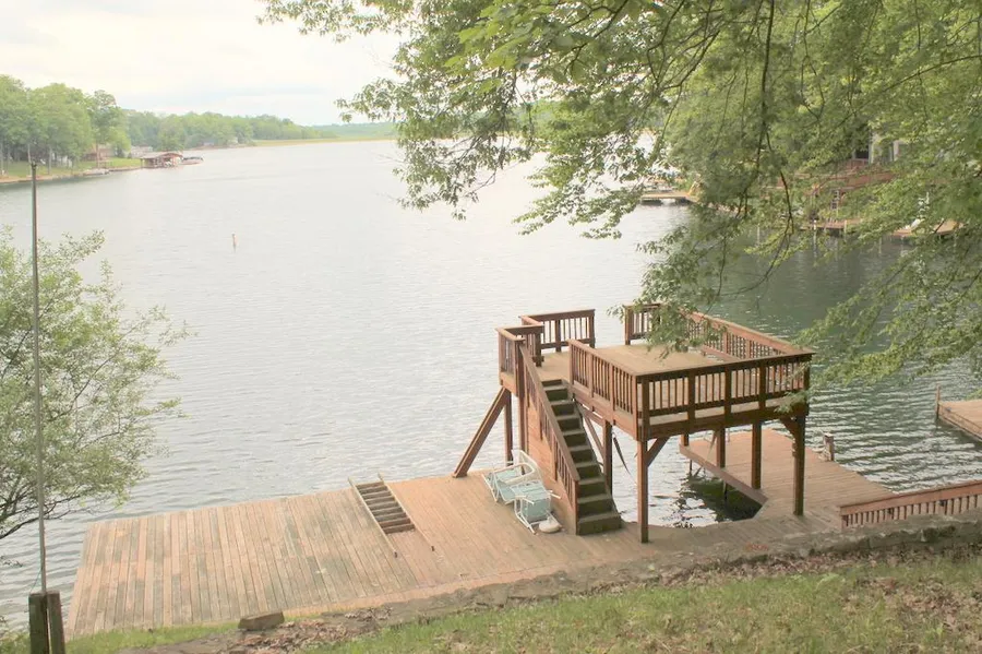 Excellent water frontage on Cordry Lake with multi-level dock/decks. Home has wood paneled walls & ceilings and features 2 wood burning native stone fireplaces. Main level has kit/dining/living room, FBA, bedroom & enclosed porch leading to open deck and steps to the lake. Lower level has 2nd kitchen, family room, 2 br's, FBA, laundry & storage. There are 2 lots with spectacular lake views. 3-car detached garage. Most furnishings to remain. Bonus room is 2nd kitchen in lower level.
