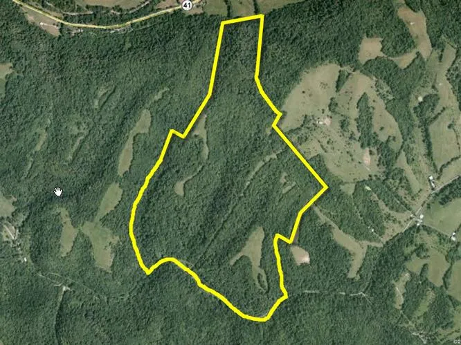 Property is mostly thick hardwood ridges and valleys with almost 15 acres of hilltop hayfields and open ground.