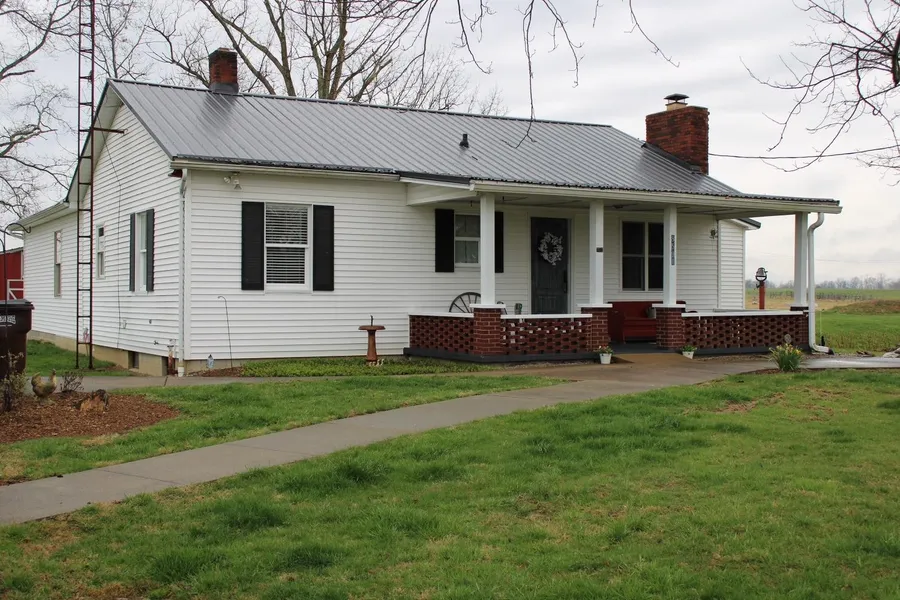 WOW amazing country charm. Interior trim masterly crafted, hardwood floors, 3 BR 2 Bath, Family Rm, Great rm w/built-ins around WB or pellet fireplace. Crafted barn doors on pantry & on beautiful Master & adjacent bath. Covered front & side porches. Partial basement. Huge barn, corn crib, shed, carport, fenced dog run, situated on five acres with pond stocked with bass & blue gill. Awesome sunsets!