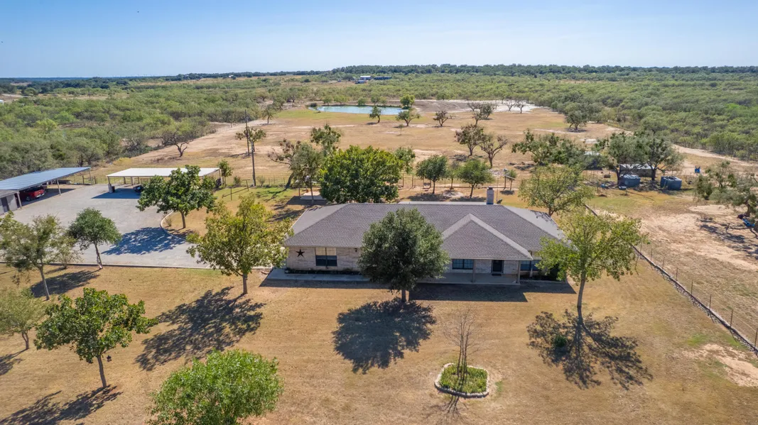 Spanning 17 acres, this property includes a spacious 3 bedroom, 2 bath home with an office and a large tank, offering endless possibilities for those interested in raising goats, horses, or other livestock. Located approximately 4 miles beyond the Brownwood Country Club - offering golf, tennis, pickleball, and fine dining - this property combines convenience with rural charm. Ample storage is available for vehicles and equipment with 6 spaces in 2 carports, a 2-car garage, and a substantial storage building. Designed for entertaining, the open-concept layout flows seamlessly from the cozy fireplace indoors to the expansive back patio, perfect for grilling and gatherings. The adjoining office located off the primary suite is versatile, and ideal for work or hobbies, while the kitchen impresses with granite countertops, a double sink, a refrigerator, and a large built-in hutch. Additional features include a spacious utility room with cabinets and a closet, numerous outbuildings for animals and hay. Water hydrants and electric outlets are thoughtfully placed throughout the property.