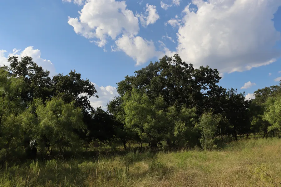 Large mature live oaks, along with post oak, American & cedar elms, some pecans & mesquite trees.