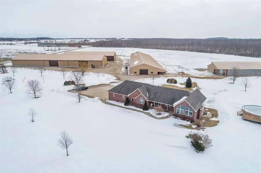 Gorgeous country setting awaits you. Open concept Ranch home built in 2000 with open concept design and finished walkout lower level. Paved & concrete driveway withnumerous outbuildings built since 2000. Building 1 - 80x320 which has 60x50 insulated/heated shop, 20x110 covered overhang and rest of building is storage with concrete floors. Building 2 - 80x260 concrete floor storage. Building 3 - 70x190 storage with concrete floor + 25x80 covered overhang. Building 4 - 50x120 Beef barn with drive through feeding & head lockers.(Building sizes approx) Acreage is approx. 39 ag, 36 wooded, 11 Res