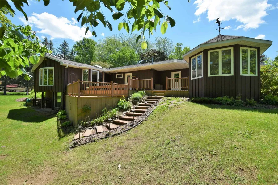 Stunning ranch home w/ timeless character in the Village of Howard. Exceptionally beautiful main living space with vaulted wood ceilings, skylights, bar, corner stone fireplace, & open concept kitchen/dining area w/ an amazing view of the private pond. Huge main level master bdrm w/ walkin closet. Lower level is mostly finished incl. wet bar, fireplace, office area and family room or 4th bdrm. Vast property includes lush, mature trees, large maintenance free deck, gazebo, and shed with power. Be sure to relax in your very own sauna and have fun in sun while enjoying your private pond. Huge garage with plenty of space for your toys. Additional large parking slab. Picturesque double lot sitting at the edge of this quiet neighborhood. Additional Bar area on LL as well!