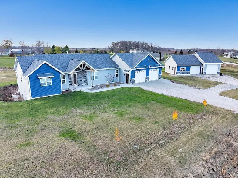 Sprawling modern home built in 2022 & listed under appraised value! Room to Expand w/3.67 acres w/huge side yard great for fruit trees, garden, another building or animals. Horseshoe drive leads to extra deep attached garage & a 44x26 garage w/plumbing & gas to building. This sun filled home features vaulted ceilings, luxury plank flooring & modern fixtures throughout. Gourmet kitchen boasting stainless steel appliances, walk-in pantry w/barn door entry & center island w/stainless top providing a heat, water & stain resistant workspace. Door off kitchen to covered grilling patio. 2 bedroom suites on main level & 1st floor laundry. Primary has 2 walk-in closets, Kohler soaking tub & walk-in shower. Family room, another bedroom & 2 bathrooms downstairs. LL photo virtually staged