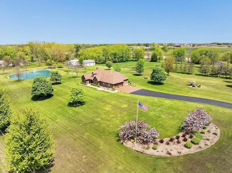 Immaculate 5+ Acre Estate Just Minutes from Town! This breathtaking property is set on beautifully landscaped grounds with serene, stocked pond featuring fountain, dock & cascading waterfall. Plus 2 outbuildings with their own driveway. Stunning all brick ranch home boasts great room with vaulted ceiling, fireplace and a huge window overlooking the beautiful setting. Gourmet kitchen features antique finished cabinetry, stainless appliances, walk-in pantry & dining area w/French doors to a relaxing patio complemented by 8-person hot tub. Retreat to the primary suite highlighted by oversized walk-in closet & bath w/whirlpool tub & custom stone walk-in shower. Split bedroom w/1 bedroom used as office. Lower has spacious rec room with bar area, exercise room with sauna and another bath.