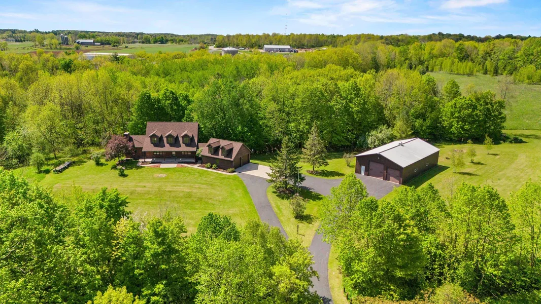 Tucked away on nearly 18 acres of pristine, wooded privacy, this one-of-a-kind property offers peace, seclusion, & natural beauty at every turn. Meandering creek, mature trees, & wooded backdrop create a tranquil retreat ideal for nature lovers or those seeking quiet living. Unique & versatile layout w/ soaring ceilings & large windows that bring natural light in. Main-level office wood-burning FP offers the perfect work-from-home escape. Kitchen is equipped with newer appliances & opens to a charming 3-season rm, ideal for relaxing & enjoying the views year-round. Massive approx 36x64 outbuilding provides incredible storage or workspace, complete with 10 and 12 overhead garage doors perfect for equipment, vehicles, or hobbies. Comfort, functionality, nature in perfect harmony.