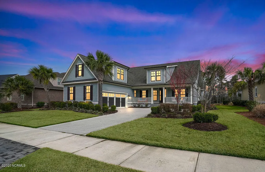 This beautiful coastal style luxury home is located on one of the most majestic home sites in the award-winning community of Brunswick Forest! Amazing panoramic views of a serene pond, the 3rd fairway of Cape Fear National Golf Course and a natural wooded preserve offering natural beauty and privacy. The expansive covered front porch leads into the foyer of this open concept home. The formal dining room with a trey ceiling and wainscoting is perfect for any family gathering and it is adjacent to the dedicated home office. Gourmet kitchen features coastal cabinetry with dovetail & soft close drawers, granite counters, raised bar with room for seating, plenty of cabinet & counter space, under cabinet lighting, large pantry, tile backsplash & a custom wood ventilation hood. KitchenAid stainless appliances consist of a convection wall oven, microwave oven, dishwasher and a 5-burner gas cookt...
