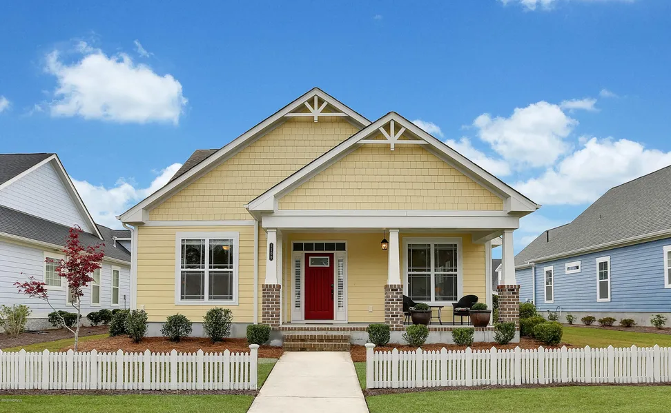 Find perfection in this beautiful coastal home located in the Shelmore community of Brunswick Forest! Walkable to Hammock Lake, the pool and fitness center make this an ideal location. This incredible light-filled home offers coastal charm and a functional open floor plan that is great for everyday living and entertaining! The inviting covered front porch leads into the foyer featuring wainscoting and hardwood floors that flow through the main living areas. Spacious great room includes a natural gas fireplace with a custom mantel, a stunning coffered ceiling & an arched entryway into the master suite. Adjacent to the great room is the dining room accented with wainscoting and the coffered ceiling. The well-planned kitchen has granite counters, a large center island with counter height bar, tile backsplash, oversized double door pantry with wood shelving, and stainless appliances includin...