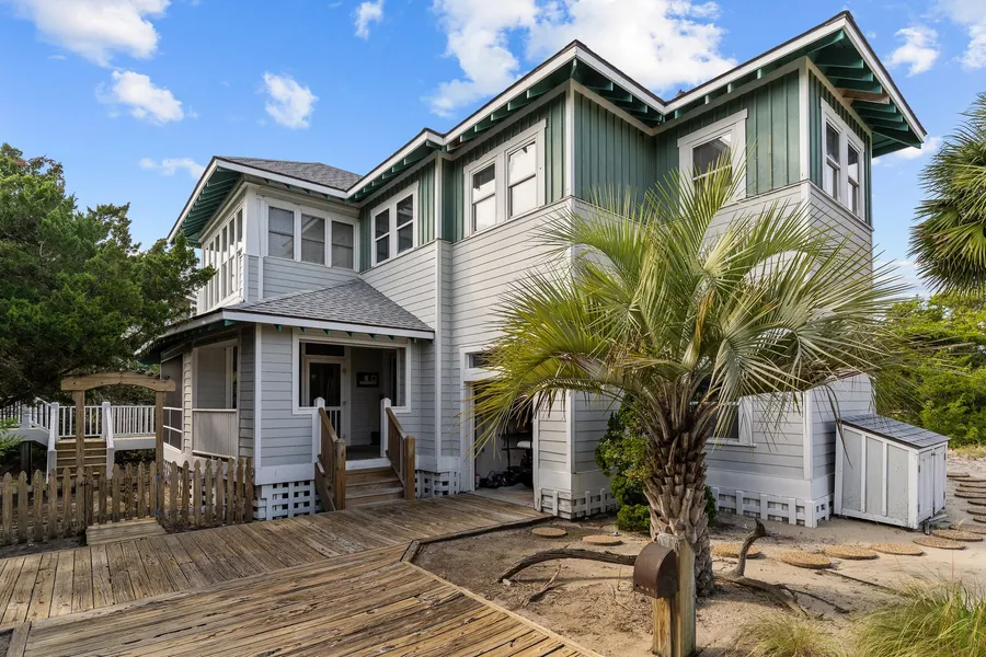 Amazing opportunity to own a 5 bedroom, 4 1/2 bath, reverse floor plan home with views of South Beach. The welcoming foyer has plenty of room to create a drop zone for all your beach gear. There are two bedrooms on this level, one that could be used as a primary suite with a full bathroom attached. The other accesses a full hall bathroom. Both downstairs bedrooms flow to a screened porch. Upstairs has a soaring vaulted ceiling with a large open concept living room, dining area and kitchen. There is an open eating deck off the back that leads down the steps to the grill. The front sunroom offers views of South Beach. There is another primary suite with a full bathroom attached that also has ocean views and two more bedrooms (one a bunk room) share a full bath. There is also a half bathroom on this level. Outside there is a screened gazebo. An Equity Lifestyle Membership to the Bald Head I...