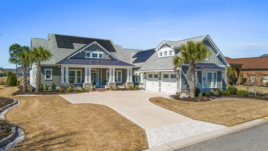 The Finest Residence in Compass Pointe - 2236 Compass Pointe North Wynd Welcome to the pinnacle of luxury and comfort in Compass Pointe. This exquisite home blends coastal coziness with contemporary elegance, designed for both grand entertaining and intimate evenings. Cul-de-sac location! Step inside to a welcoming foyer leading to a refined dining room and an intimate living space with a stunning floor-to-ceiling stone fireplace and coffered ceiling. The heart of the home is a gourmet kitchen featuring a 12-foot granite island, Bosch double ovens, a Thermador 6-burner cooktop, and a spacious walk-in pantry. Adjacent is a magnificent family room with a soaring wood-covered ceiling, built-in bar, and motorized blinds for the perfect ambiance. Enjoy year-round comfort in the enclosed lanai, offering serene views. The main-floor master suite boasts a 12-foot ceiling, spa-like bath with zero-entry shower and soaking tub, and custom his-and-hers closets. A convenient laundry room and ample storage complete the first floor. Upstairs, a private guest retreat includes a bedroom, full bath, game room, and office. Outside, beautifully manicured gardens, a stone patio with fire pit, and breathtaking sunsets over the pond and golf course set the scene. Thoughtful upgrades include a fenced backyard, solar panels with battery backup, whole-house generator, and EV charger. This meticulously maintained home truly offers it all—don't miss this rare opportunity!