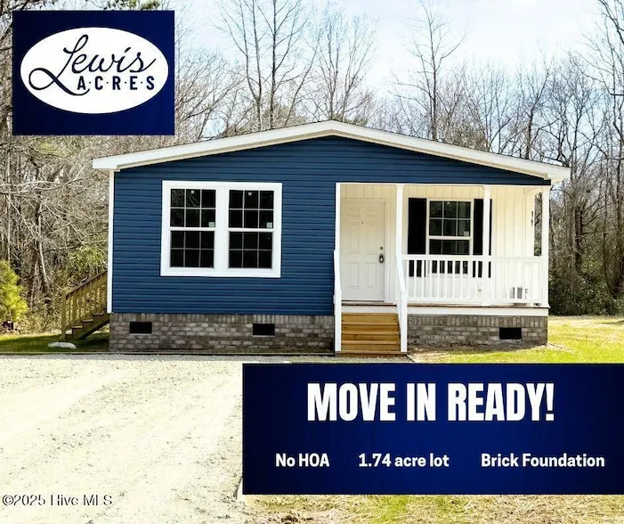 Looking for a BRAND NEW HOME outside of an HOA for a great price sitting on a 1.74 acre lot?? Look no further!! This brand new Champion beach bungalow is exactly what the doctor ordered! Located in Lewis Acres, no monthly HOA fee and located only 10 minutes off of Hwy 17 for easy access and privacy, less than 20 minutes to shopping and dining, and multiple beaches within a short drive.! Pulling up to this home, you'll appreciate the full masonry brick foundation and covered porch! Inside you'll love the stainless steel kitchen appliances with lots of counter space! The open floor plan will allow you to decorate and entertain without worry. A nice sized master bedroom hosts a private bathroom with double sinks, a walk in shower and soak tub. Across the home are two additional bedrooms and a bathroom for your guests. In addition to no monthly HOA fee, the home is on a private well and septic system, allowing you to continue to save monthly on your expenses! With no HOA, bring the boat and RV without worry!! Let us help you make coastal living make sense with the freedom of our new home here in Lewis Acres!